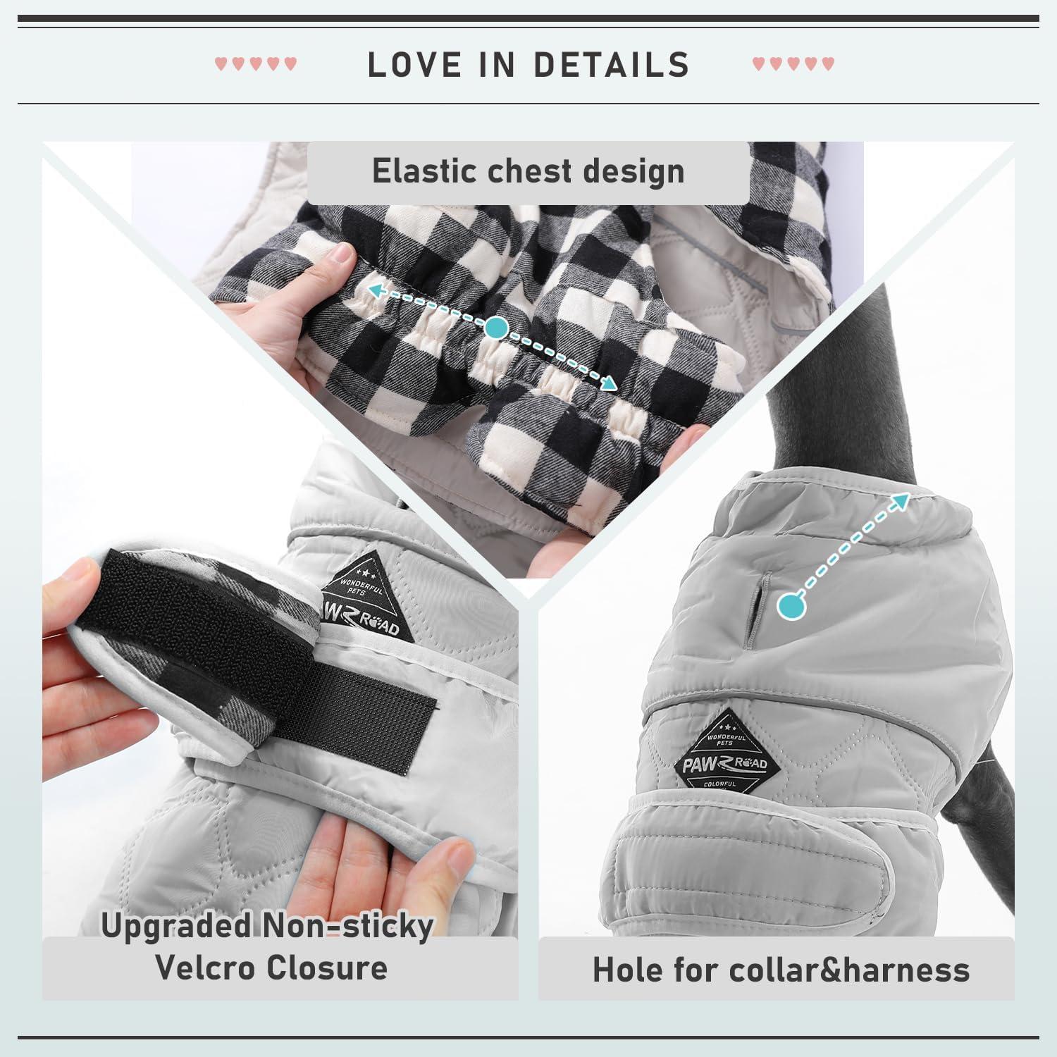 Windproof and Water-Repellent: Our lightweight, three-layer dog apparel ensures optimal warmth and comfort with its skin-friendly woven plaid, padded cotton, and waterproof exterior. Thanks to ultrasonic embossing technology, it's pinhole-free, washable, and perfect for protection against cold and water.